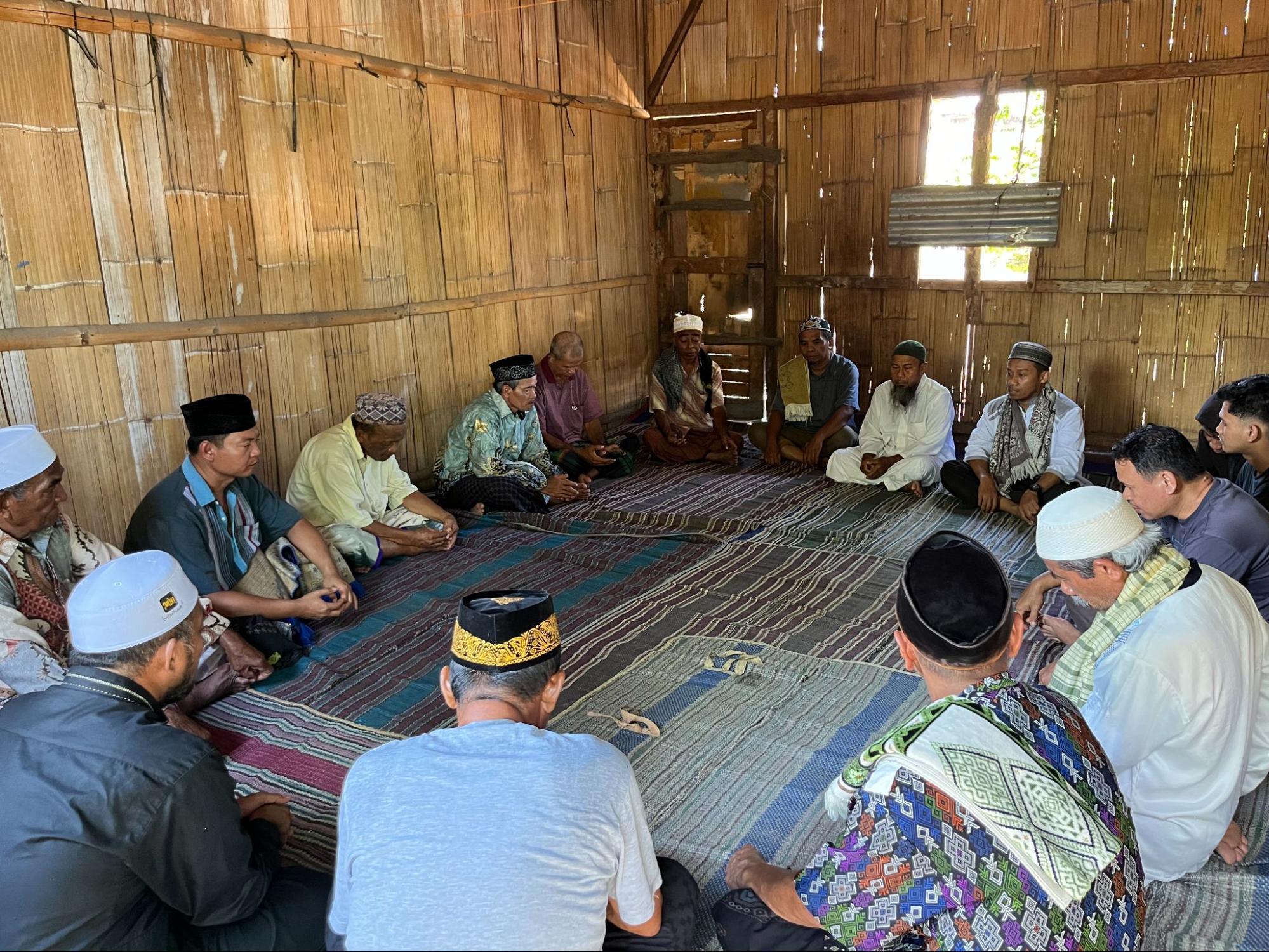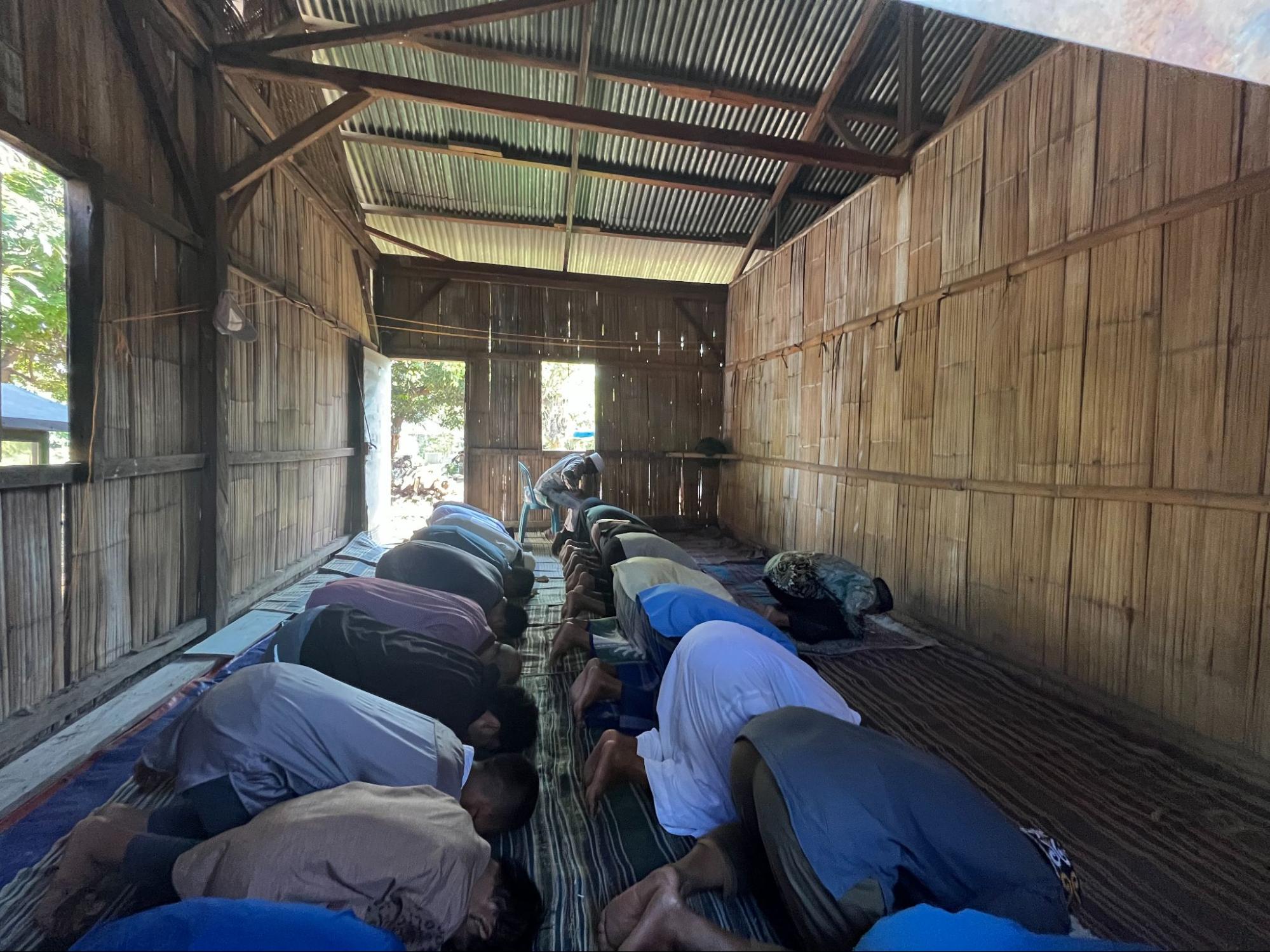 Kini, warga hanya bisa beribadah dan mengaji di bangunan darurat yang sempit, terbuat dari kayu, bambu, terpal, dan seng yang tidak kokoh. Kondisi ini sangat berisiko, apalagi ketika hujan dan angin kencang menerpa.